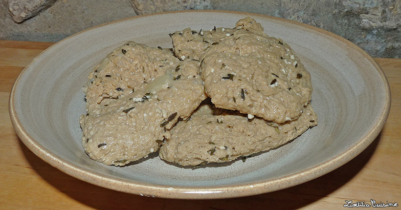 Je n’ai pas travaillé la pâte avant de la façonner et de la panner car elle était hyper collante (surement à cause de l’oublie de la farine de riz). Pour la taille, j’ai essayé plusieurs format (boulettes, galettes, boudins…) mais sur la photo, avant cuisson je dirais que c’était des galettes de 6-8 cm de diamètre. Après tu peux faire comme tu veux je pense, certaines recettes font cuire le seitan d’un seul bloc et le découpe ensuite. J’ai préféré faire des petits morceaux pour que le goût soit plus intense. Je n’ai jamais mangé de seitan du commerce mais je pense qu’il sont un peu moins « spongieux » que ma version (certainement aussi à cause de l’oublie de la farine de riz) mais ça ne m’a vraiment pas dérangé alors… j’espère que ça te plaira ! 😉