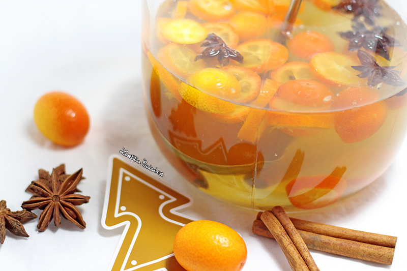 Après tout ce plein de vitamines, il est temps de clôturer cette session tendance fruit (lire aussi ICI). Encore merci à eux de m’avoir envoyé tous ces bons fruits qui nous ont tant régalé. Il est sûr que je commanderais mon panier à noël tant leurs paniers sont festifs et que cela fait plaisir de les recevoir ! Du coup, j’ai décidé de terminer sur une touche noël (et oui encore) avec un bon vin chaud qui inclut mes petits chouchous, les kumquats ! Santé !