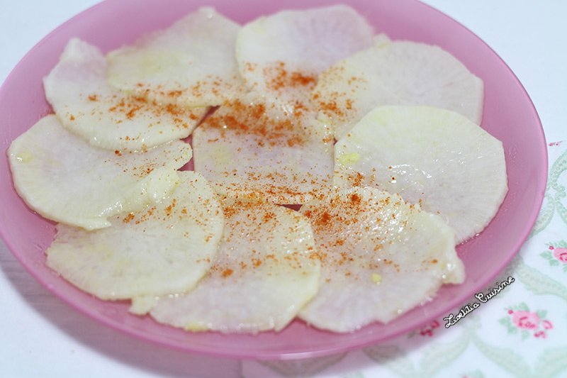 Pelez le radis blanc puis tranchez-le le plus finement possible (j’ai utilisé une mandoline). Placez les tranches de radis dans un plats creux et assaisonnez avec le reste des ingrédients. Laissez mariner au moins 1h.